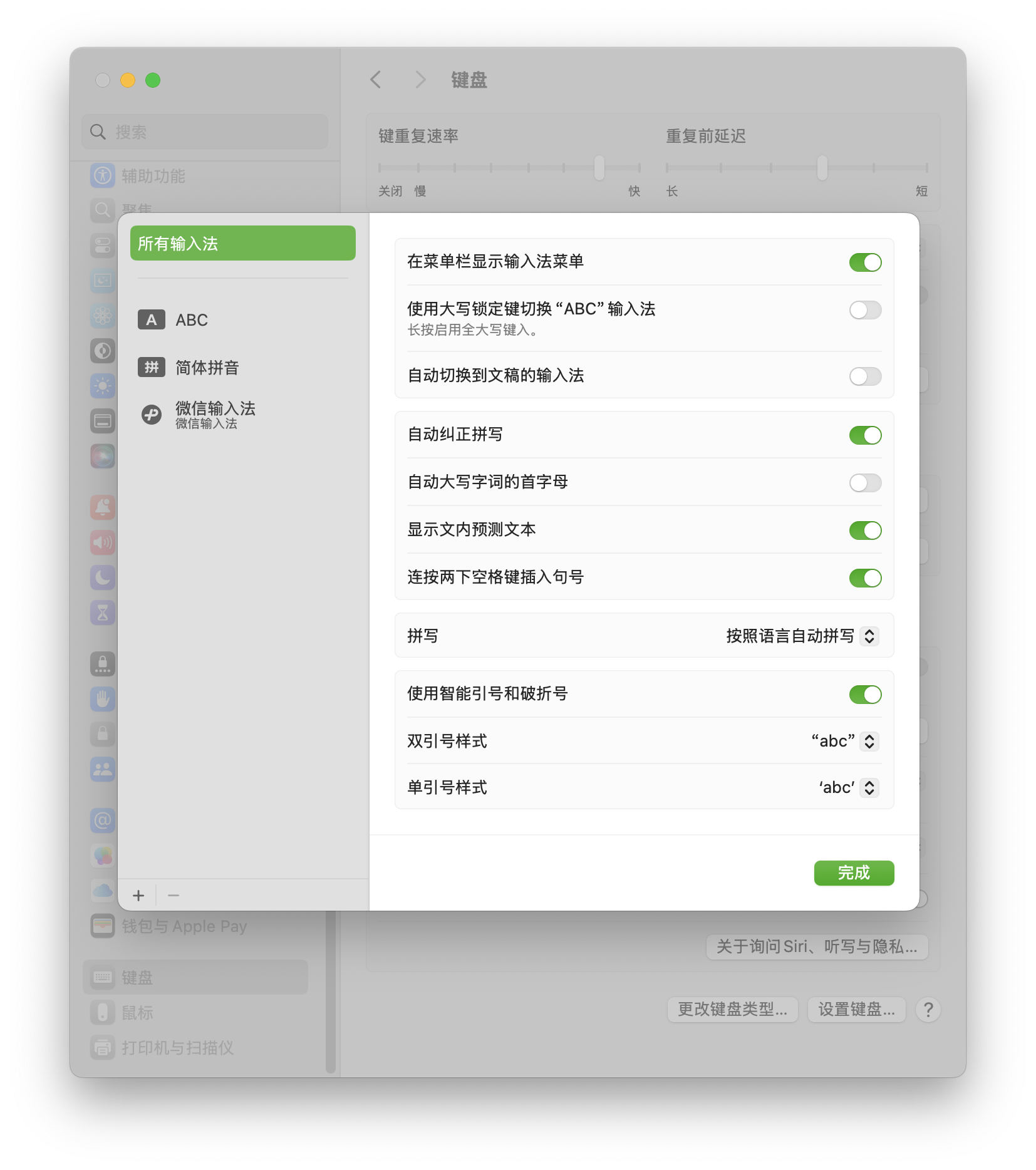 在安装微信输入法的默认设置中一项提示终于解决了这个问题。在系统设置中取消勾选**【使用大写锁定键切换ABC输入法】**项,就不再是反人类的长按切换大小写了。